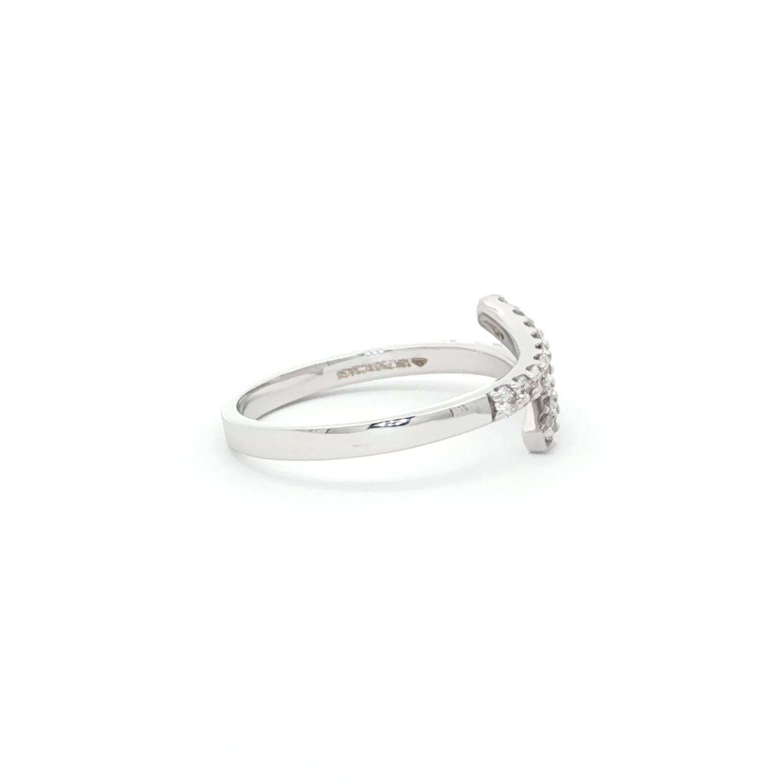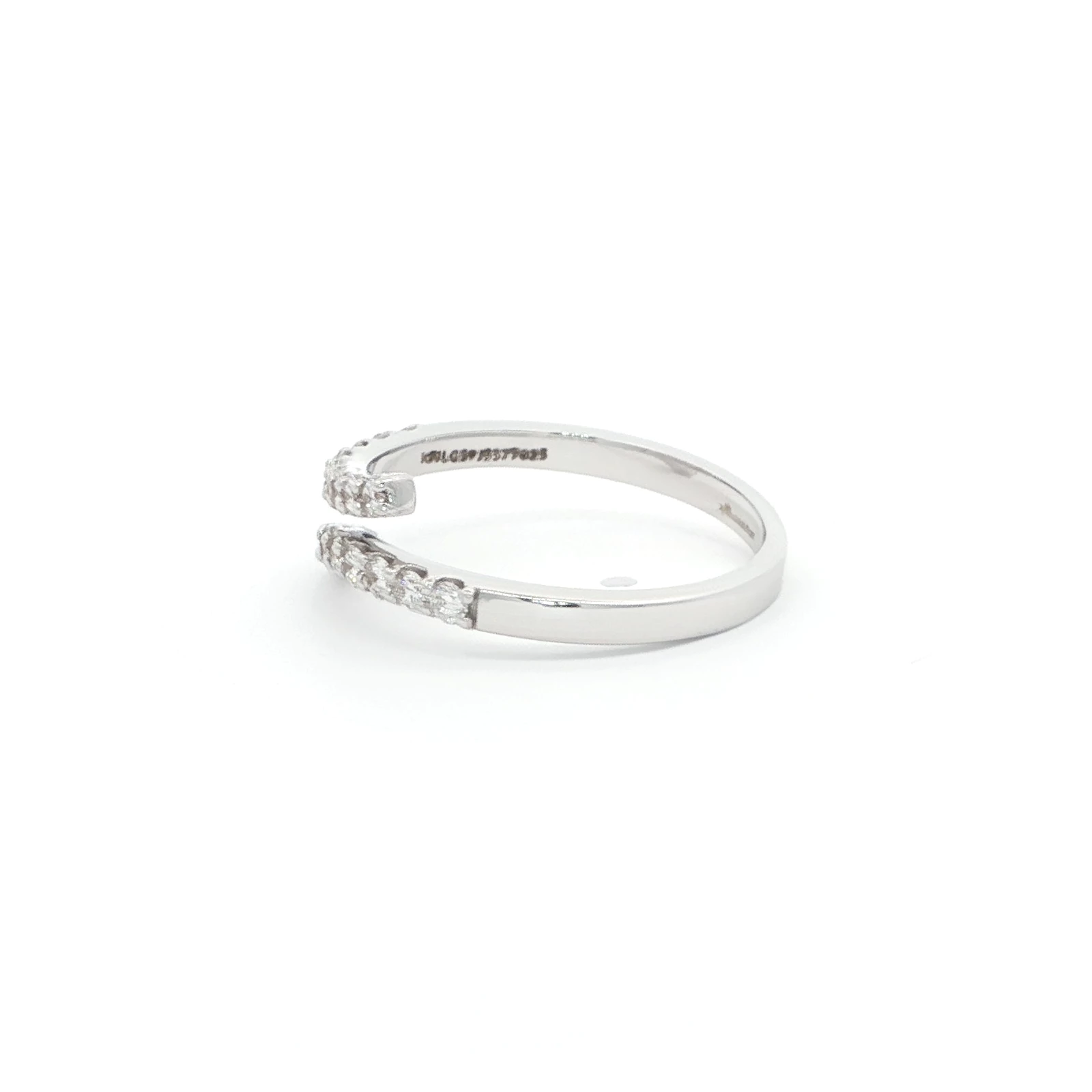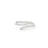 Elevate your style with this exquisite white gold multistone ring. Crafted from 18k white gold, this contemporary piece features a wrap-around design adorned with a row of round brilliant cut diamonds. Its unique form adds a touch of modern elegance to any ensemble.