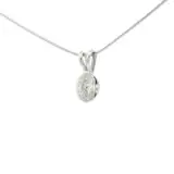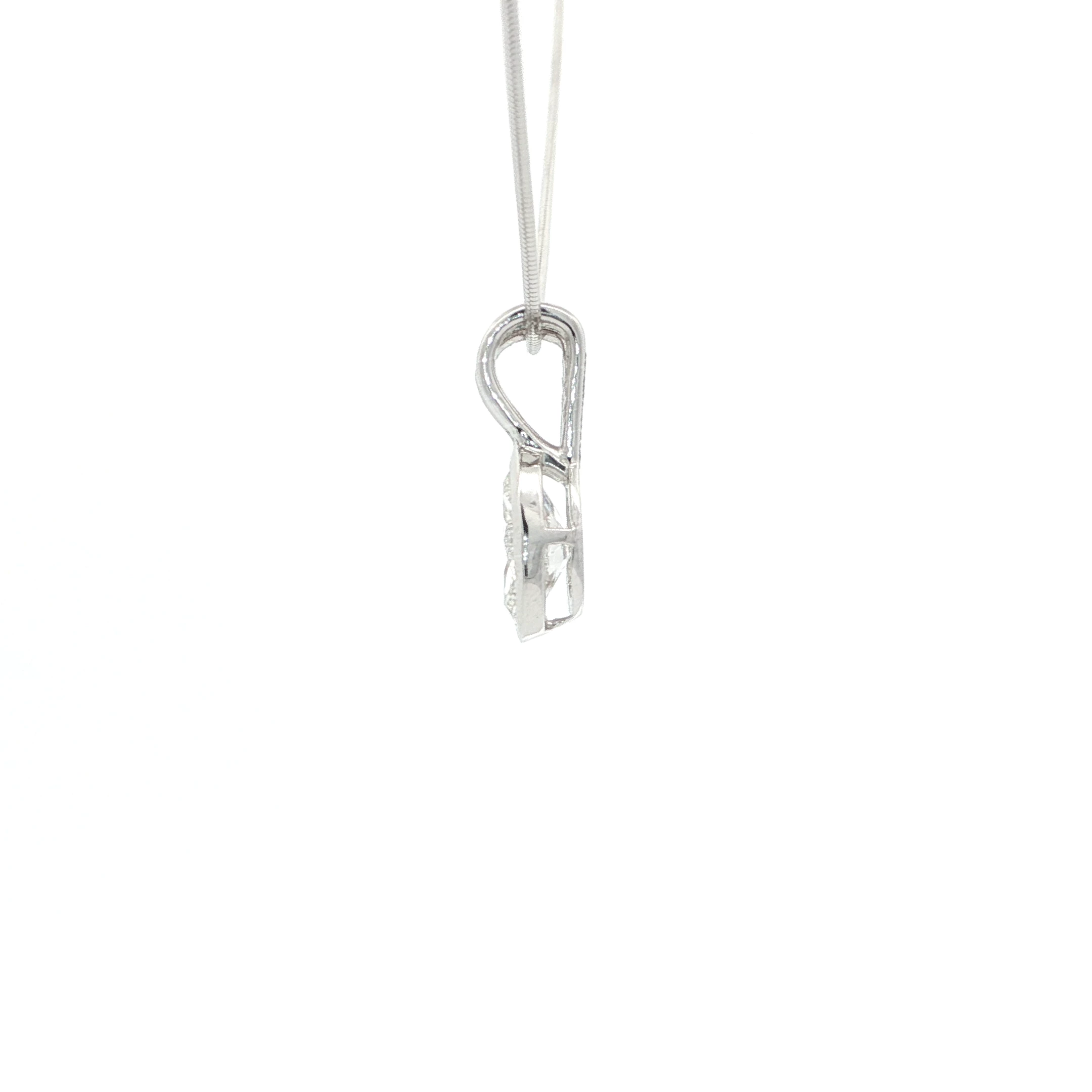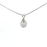 Exquisite pendant featuring an oval-cut diamond set in a lustrous 18k white gold bezel setting. The diamond exhibits a brilliant cutting style, enhancing its natural sparkle and fire. This elegant is perfect for adding a touch of sophistication to any ensemble.