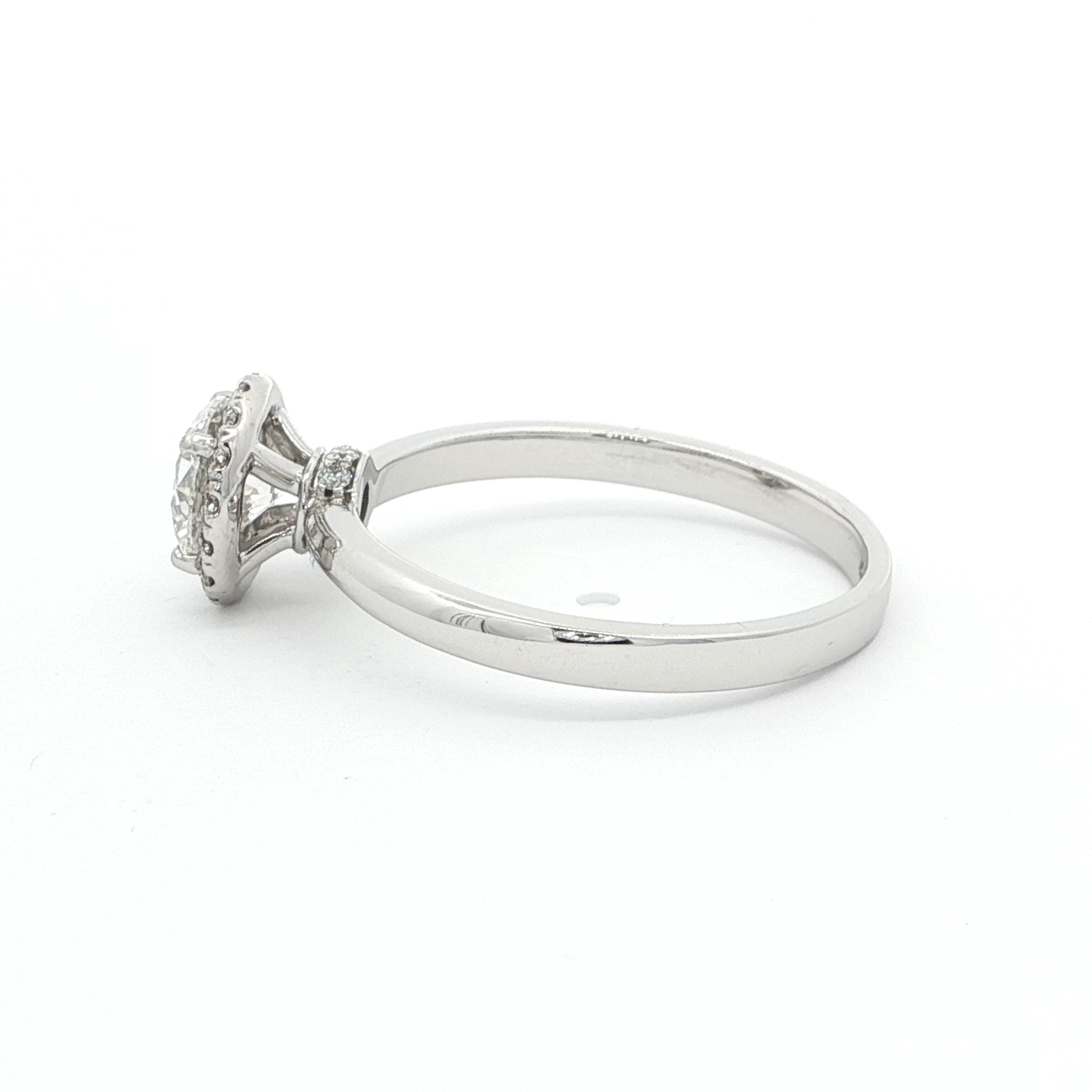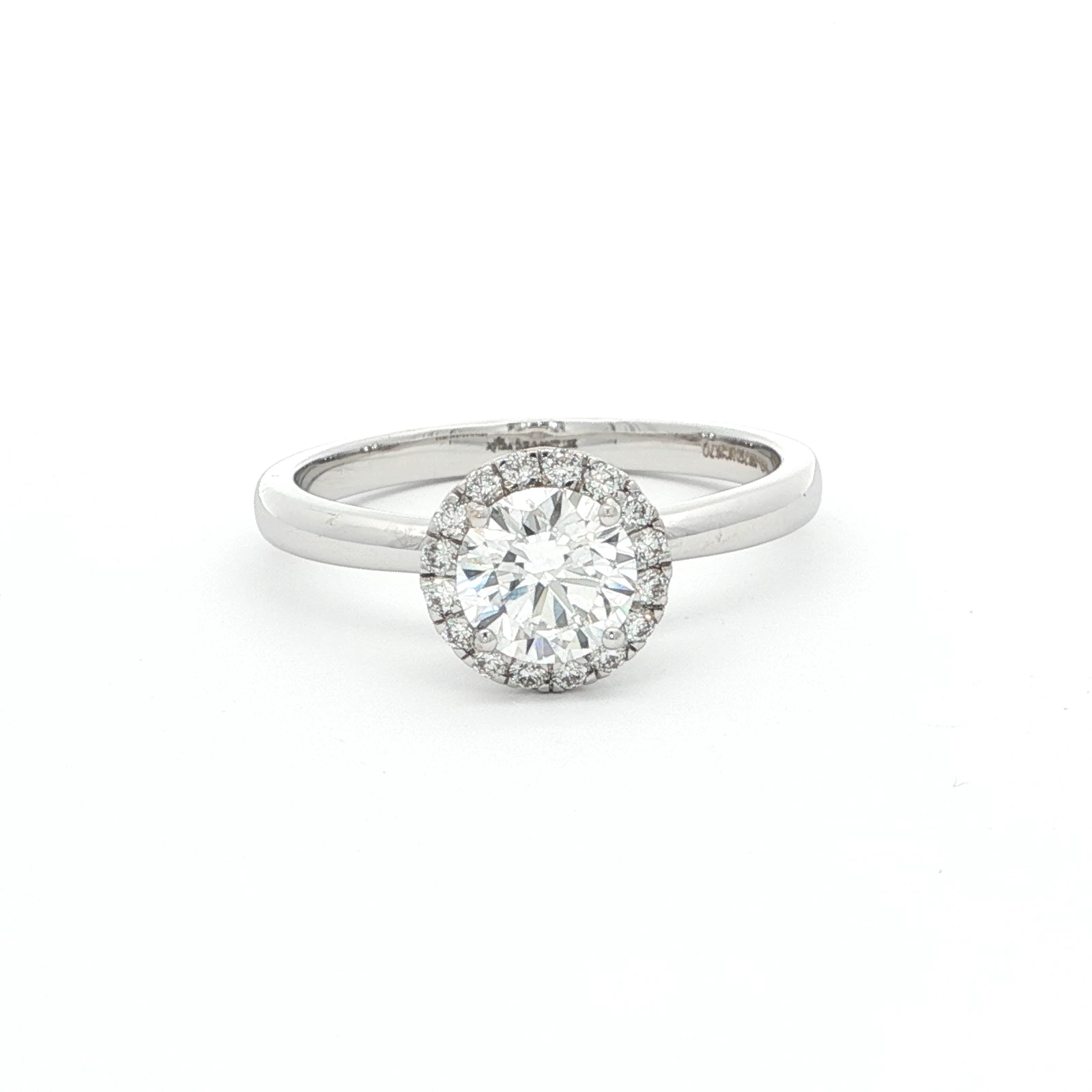 Experience timeless elegance with this exquisite 0.95 carat lab grown diamond ring. The ring features a brilliant-cut round diamond set in a halo of smaller diamonds, enhancing its sparkle and allure. The 18k white gold band adds a touch of classic sophistication to this captivating piece.